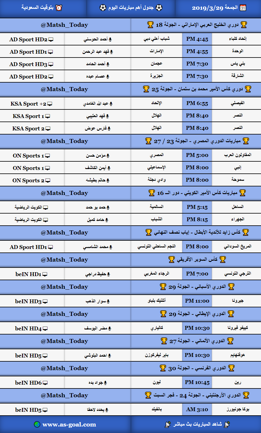 جدول اهم المباريات اليوم الجمعه 29 3 2019 المعلقين والقنوات